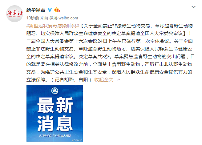 关于全面禁止非法野生动物交易的决定草案,提请审议!