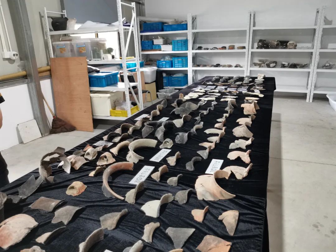 在这样的环境下,先民们显然先得靠海吃海。在基坑里,记者看到土层里夹杂着一层层的贝壳。在考古工地工作用房门外的走廊上,一排排装满各类贝壳的塑料箱摞了两三层高。而在两大间库房里,各种海生贝类的贝壳摆了“好几桌”,特别是那些巨大的牡蛎壳,大的足足有餐桌上的菜盆子那么大,由此想象一下,足以让现代的老饕们垂涎三尺。
