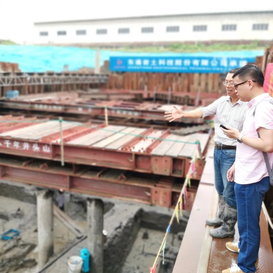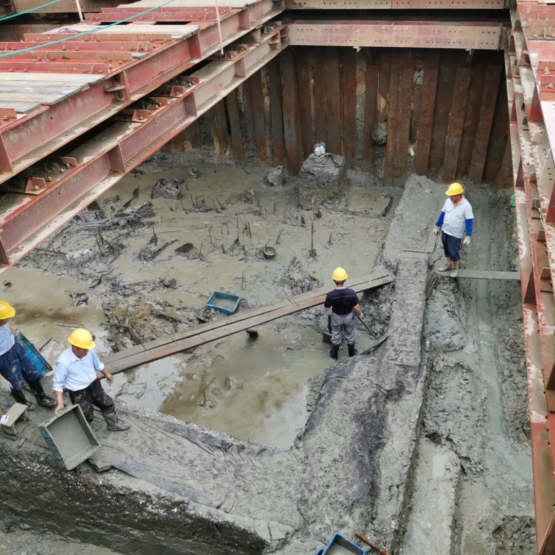 2018年3月,杭州东通岩土科技有限公司中标了钢结构围护基坑施工项目,并于2019年8月艰难地完成了这个非同寻常的基坑工程。在现场,记者看到,一根根钢板桩深扎地下,围成了一道东西长50米、南北宽15米的“钢墙铁壁”,竖直的钢板桩间还有横向的钢梁支撑加固。在南北之间,有4道钢梁连接;而在东西两头,又各有一组“人”字形的钢梁,“人”的上端分别顶住东西两端钢墙,“一撇一捺”又牢牢地固定住南北,而这组钢板墙围出的基坑,其底部最深处离地面约为10米。