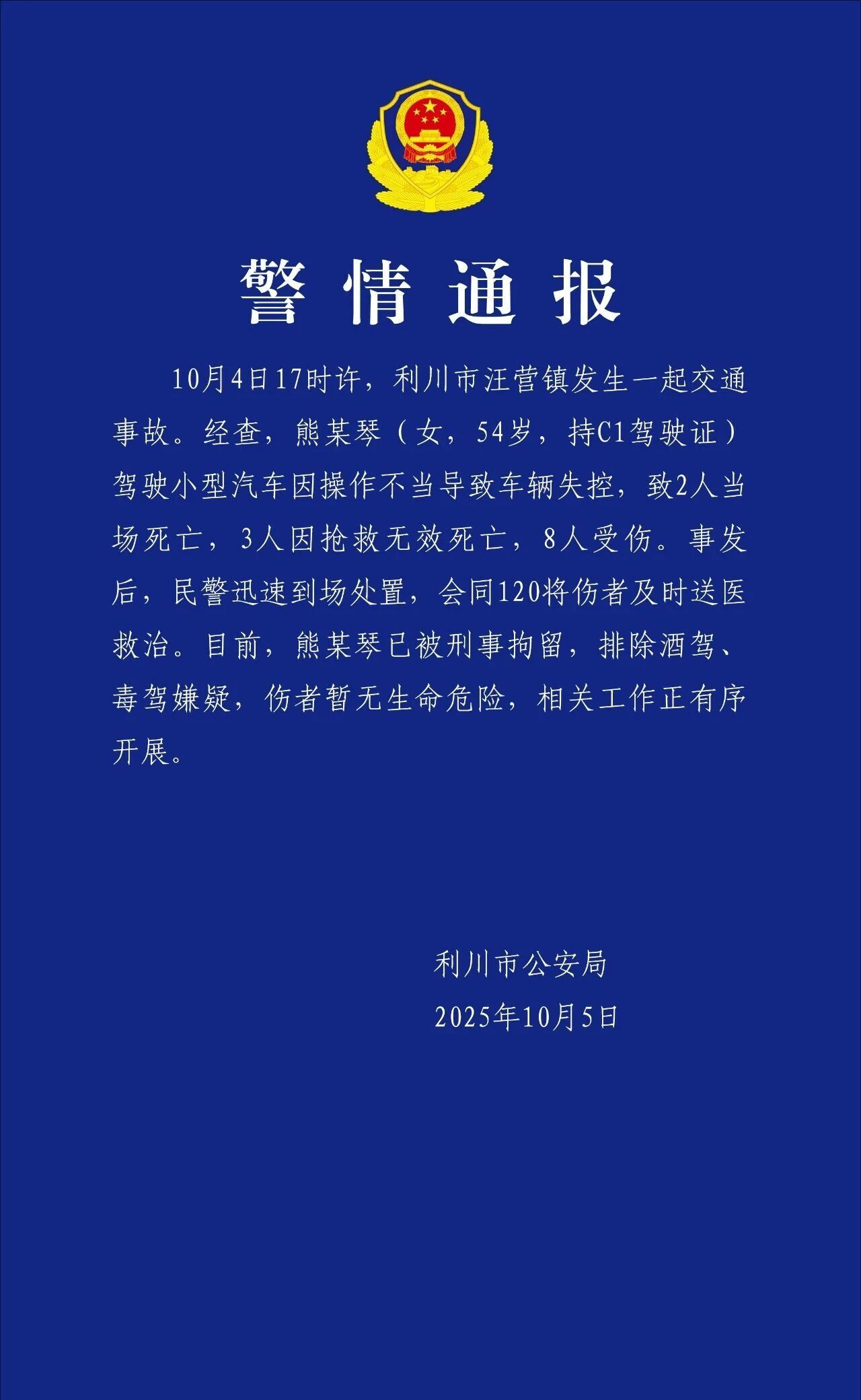 10月4日17时左右,湖北利川发生一起交通事故,致2人当场死亡、3人因抢救无效死亡,8人受伤。